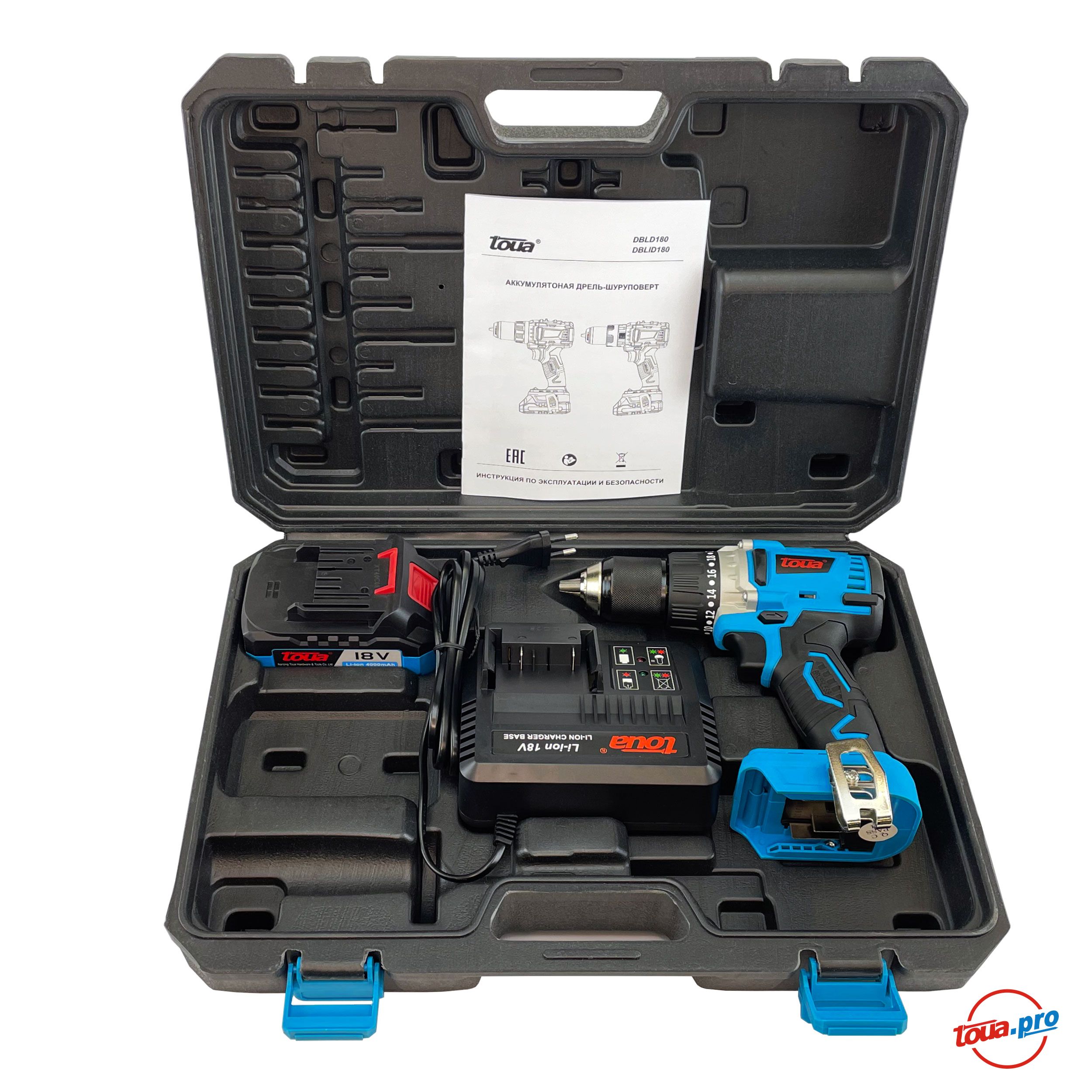 Аккумуляторная дрель-шуруповерт Toua DBLD180-1 с бесщеточным двигателем. Поставялется с одним 18В, 4А аккумулятором.