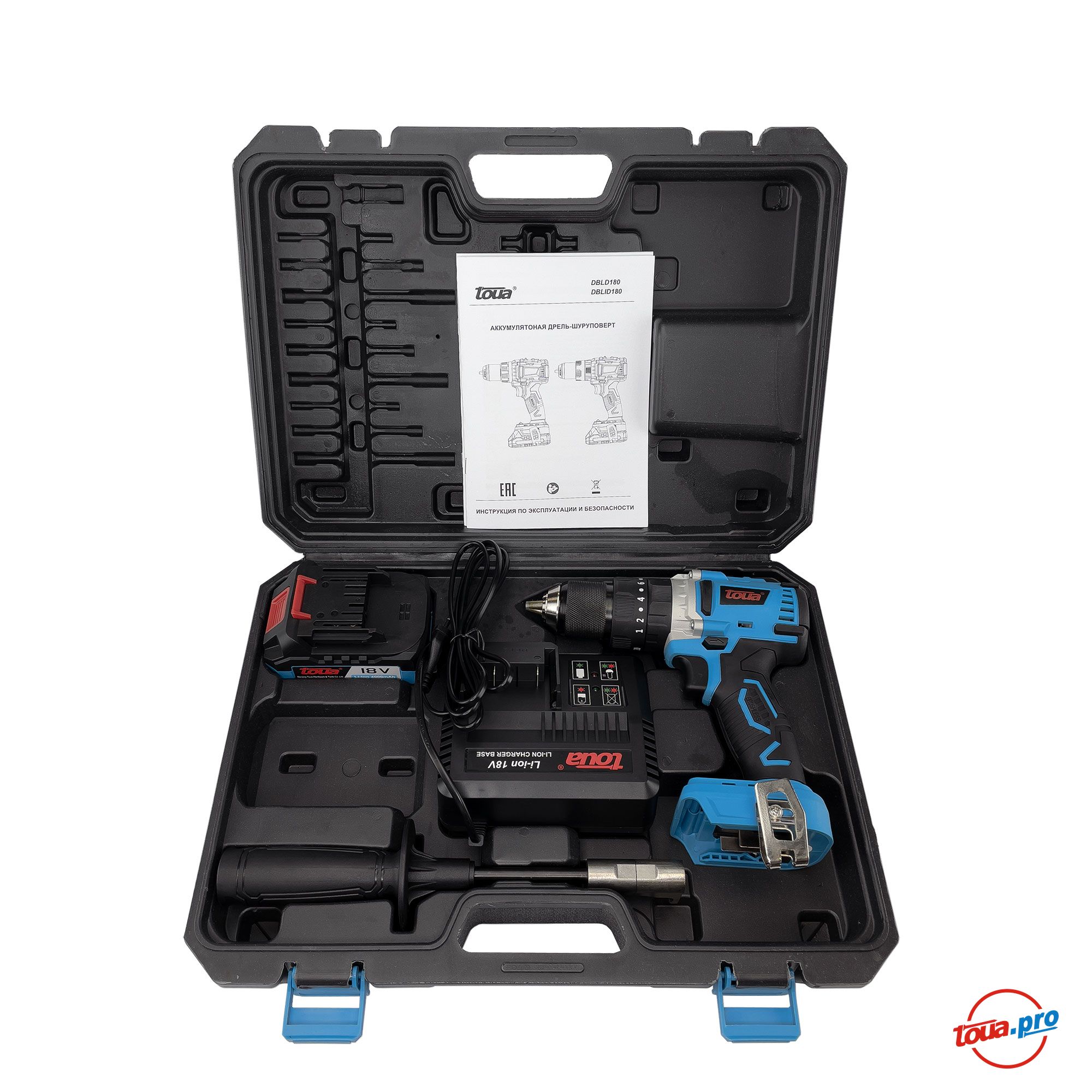 Аккумуляторная ударная дрель-шуруповерт Toua DBLID180-1 с бесщеточным двигателем. Поставялется с одним 18В, 4А аккумулятором.