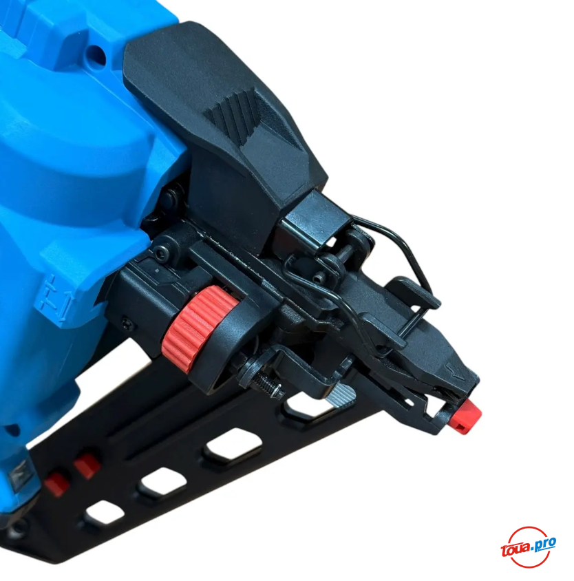 - Простой механизм регулировки глубины забивания гвоздей с защитой от холостого выстрела.