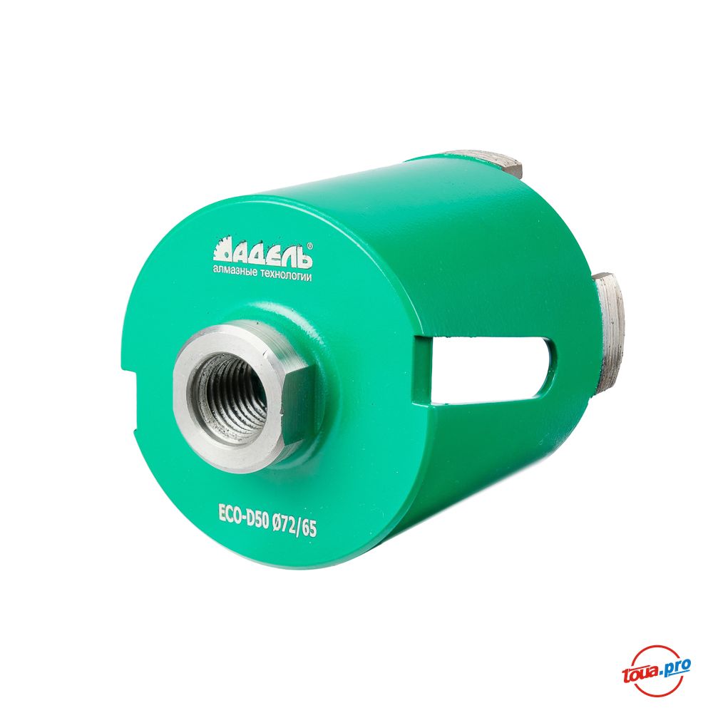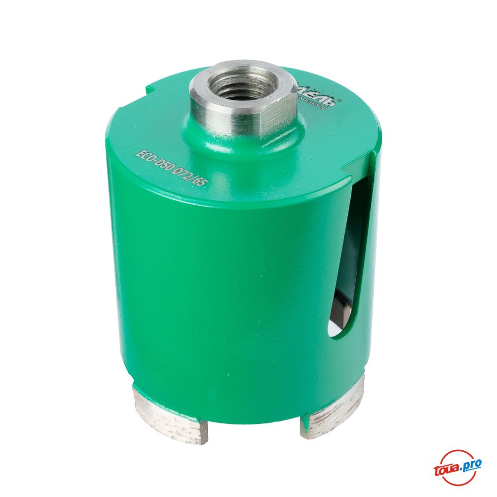Алмазная коронка для подрозетников Eco d72 мм используется для высверливания отверстий диаметром 72 мм в твердых поверхностях (бетон, железобетон, кирпич и др). Оснастка конструктивно состоит из цилиндрического корпуса, закрытого с одной стороны и открытого с другой, покрытого по краю алмазными сегментами. Инструмент подходит для совместного использования с алмазным оборудованием мощностью от 1.2 кВт. Используемый тип соединения – М16.