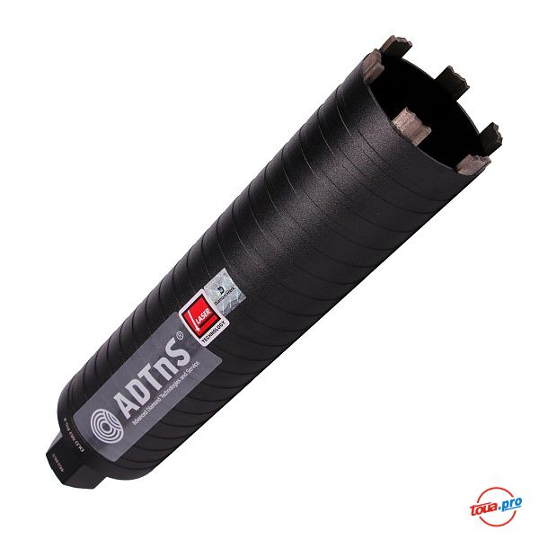 Алмазная коронка ADTnS RS-TX, разработанное для сверлильных машин с микроударом – это на сегодня самый скоростной инструмент для сверления в сухом режиме. Винтовой корпус сверла эффективно выводит шлам из зоны сверления. Алмазные сегменты, наваренные на корпус лазером, имеют турбированную форму с высокопрочным, упорядоченно уложенным алмазом. Скорость сверления отверстия 82 мм в бетоне М300 толщиной 20 см достигает 2,5 минуты без применения охлаждения.