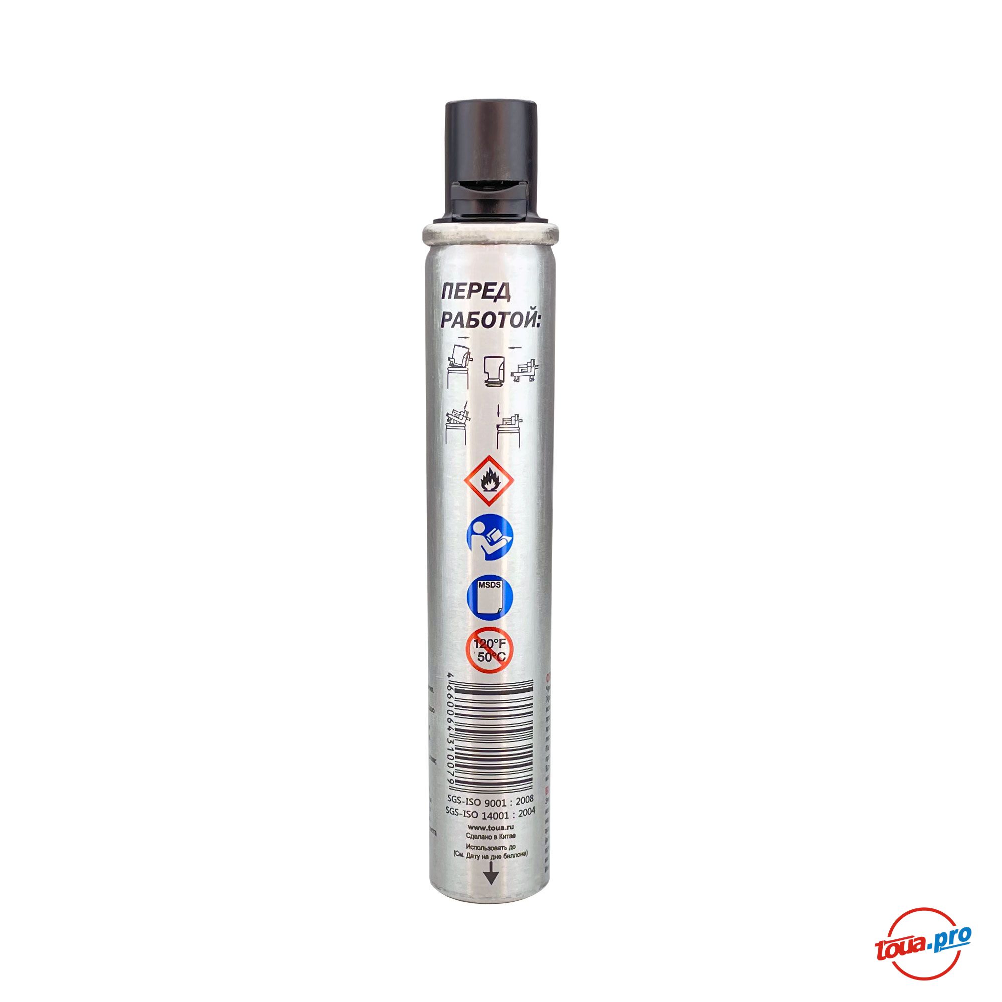 Газовый баллон Toua Premium 165 мм с зеленым клапаном для монтажных гвоздезабивных пистолетов. Длина 165 мм.