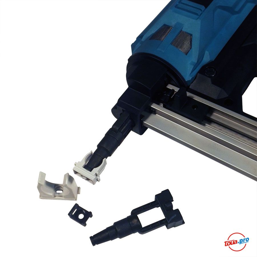 Газовый монтажный пистолет Toua GSNF1 для электромонтажников. Служит для пристрелки клипс, площадок под стяжку, пластиковых кабельканалов, держателей труб и прочего крепежа. Основной особенностью этого инструмента является малый вес, что облегчает пристрелку крепежа к потолку и наличие узкого ствола для всевозможных клипс диаметром от 16 мм.