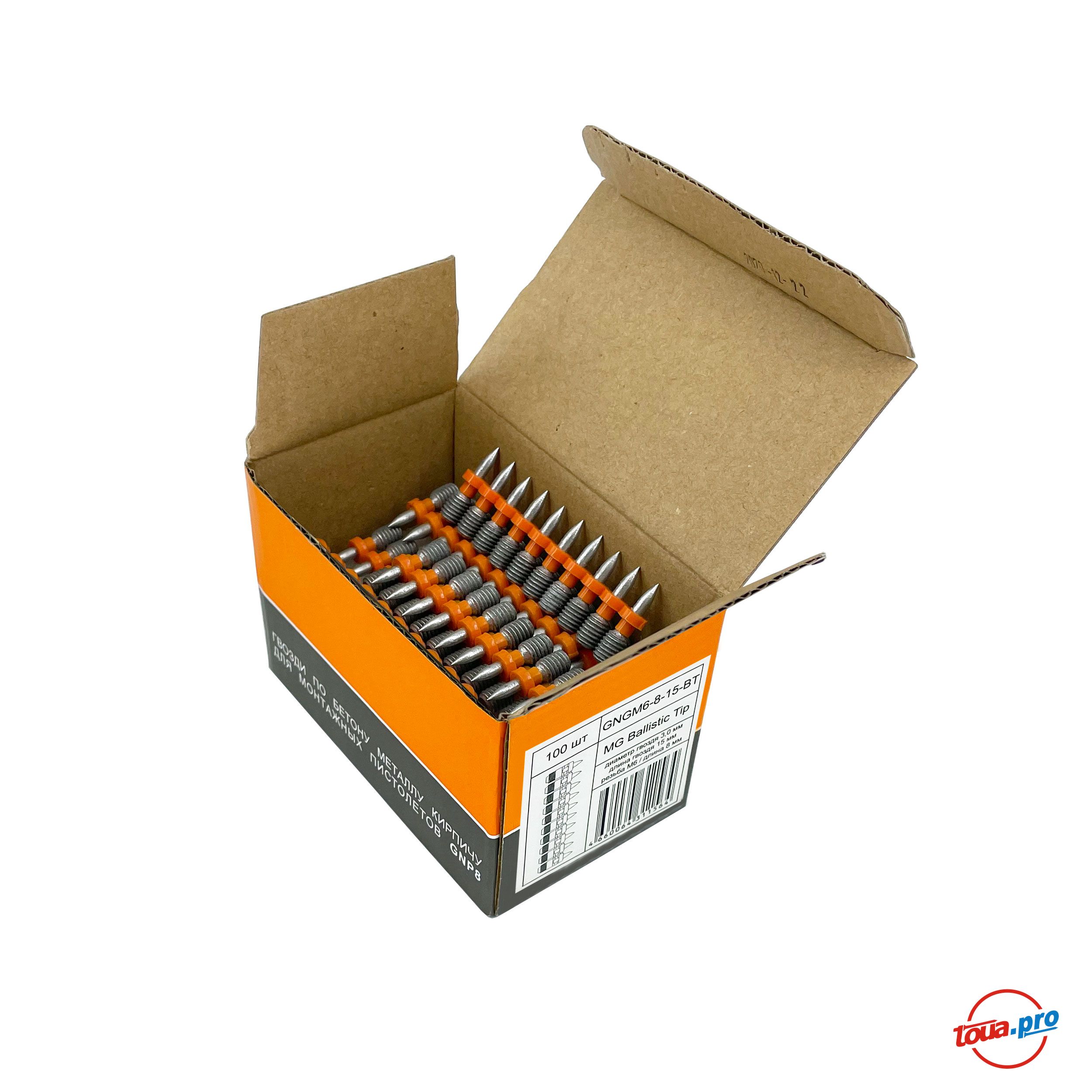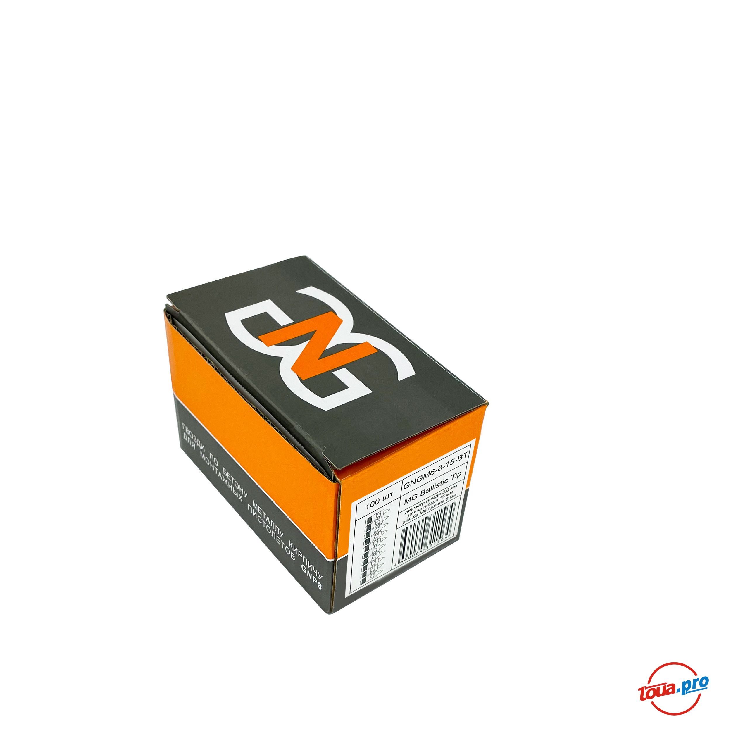 Гвозди-шпильки c резьбой по легкому бетону и кирпичу GNGM6-8-22-BT. Основное применение - создание резьбовой точки крепления на поверхности бетонного или стального основания для выполнения различных монтажных работ при помощи газового монтажного пистолета GNG1000.