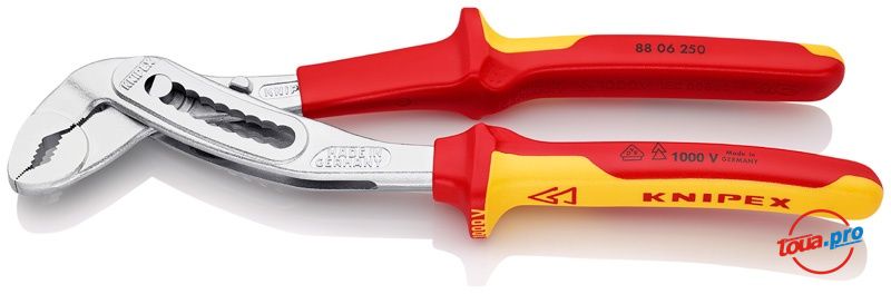Ключ сантехнический KNIPEX Alligator. Длина 250 мм, двухкомпонентные диэлектрические рукоятки до 1000 V, закаленные губки, 9 позиций установки.