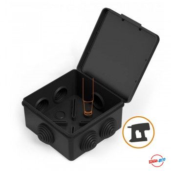 Внутренний размер 100х100х50 мм, внешний размер 108х108х56 мм, количество и размер вводов - 6 шт по 25 мм d.