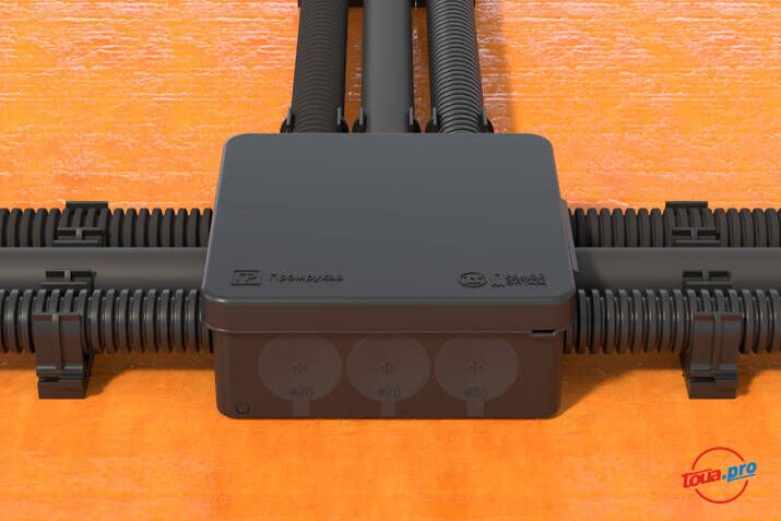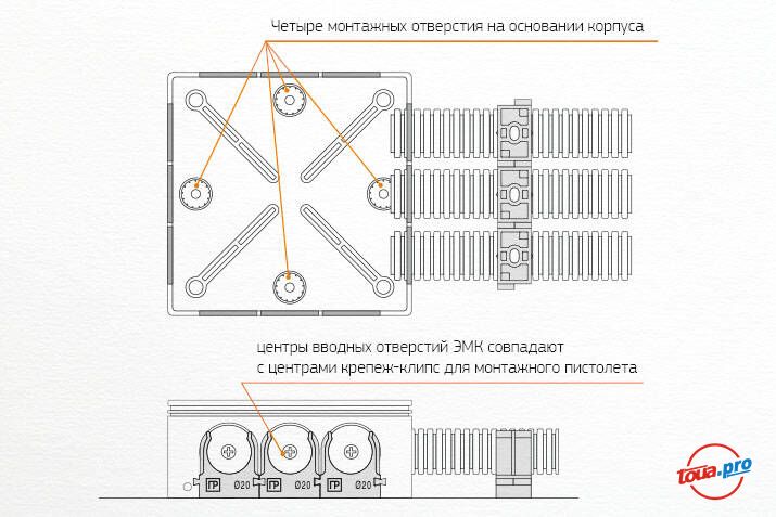 - Монтажные отверстия соосны с клипсами для монтажного пистолета Промрукав, что обеспечивает идеально ровный и эстетичный ввод труб в корпус коробки;