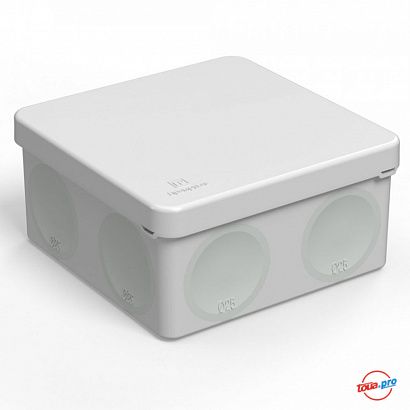 Внутренний размер 100х100х50 мм, внешний размер 108х108х56 мм, количество и размер вводов - 8 шт по 25 мм d.