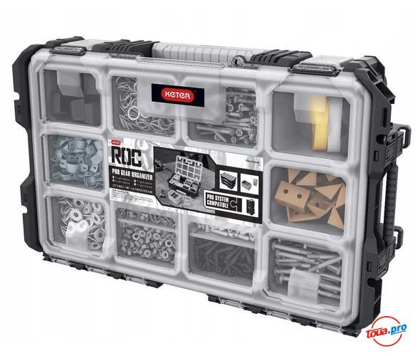 Профессиональный органайзер Keter используется для хранения мелочей. Органайзер выполнен из надежного полипропилена, с армированными ребрами. Съемные контейнеры и прозрачная крышка создают удобный обзор содержимого, но в то же время мелкие детали остаются в своих отсеках, пока вы переносите органайзер. Органайзер оснащен прочными защелками, которые защитят от попадания влаги. Сбоку имеются замки для соединения нескольких органайзеров. Удобная ручка для переноски.