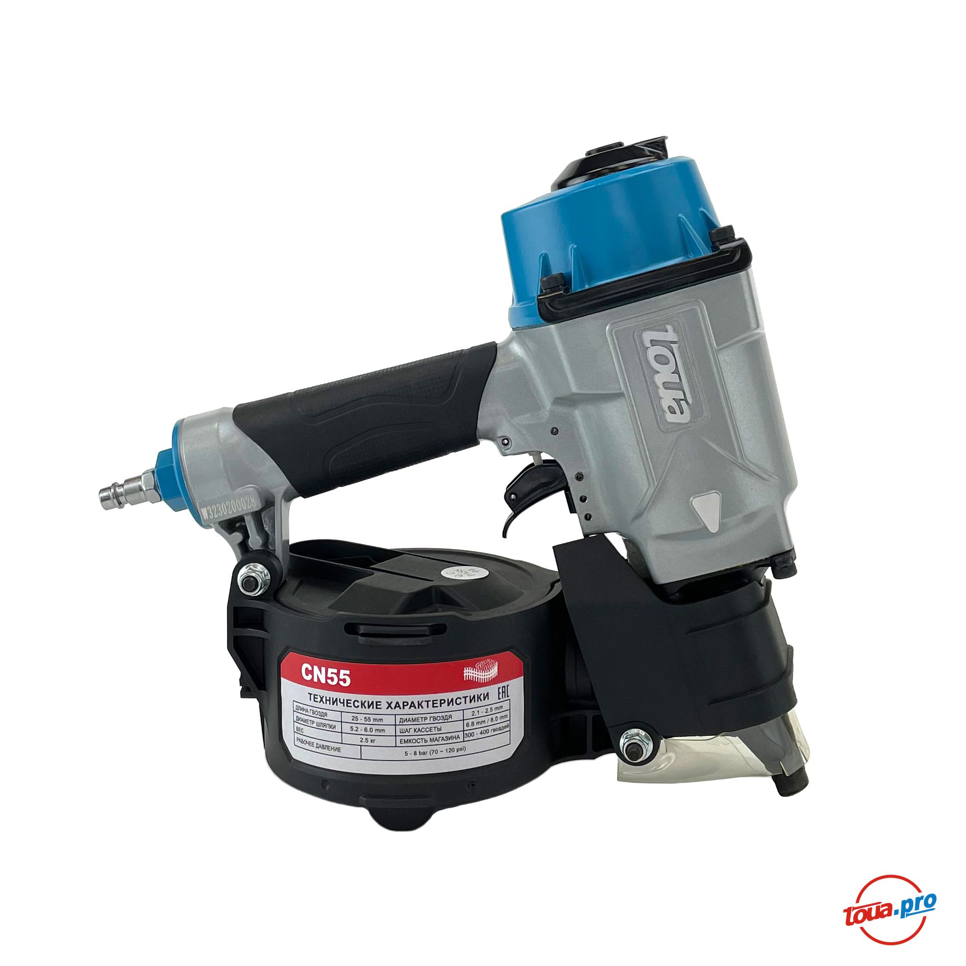 Пневматический гвоздезабивной пистолет Toua CN55 барабанного типа. Пистолет работает с гладкими, ершеными и винтовыми гвоздями соединенными между собой проволокой. Обладает высокой производительностью, большим ресурсом и низкой стоимостью точки крепления. Подходит для работ на производстве и конвейерной сборки.