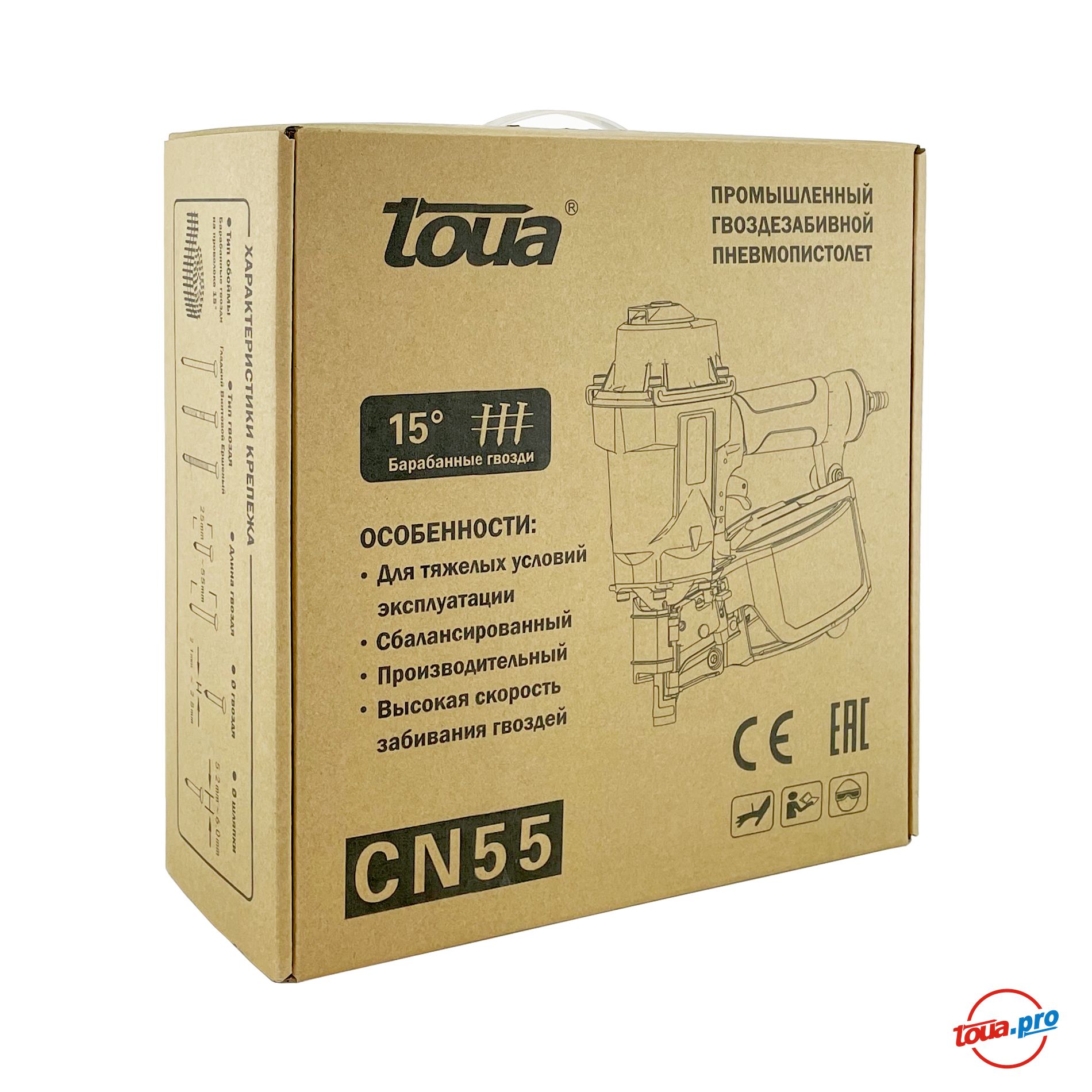 Пневматический гвоздезабивной пистолет Toua CN55 барабанного типа используется на производстве, предназначен для работ по дереву, для сборки каркасов, обрешетки и настилов.