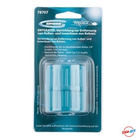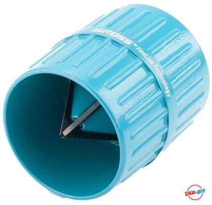 Металлический корпус риммера покрыт защитной эмалью и снабжен ножами из высокоуглеродистой стали твердостью 56-60 HRc. Габаритные размеры риммера — 5651 мм. Диаметр обрабатываемых труб — от 1/8 (3 мм) до 1/58 (42 мм). Риммер GROSS рекомендуется использовать при работе с трубами из стали типа Ст3, алюминия, латуни, меди, металлопластика, ПВХ и пр.