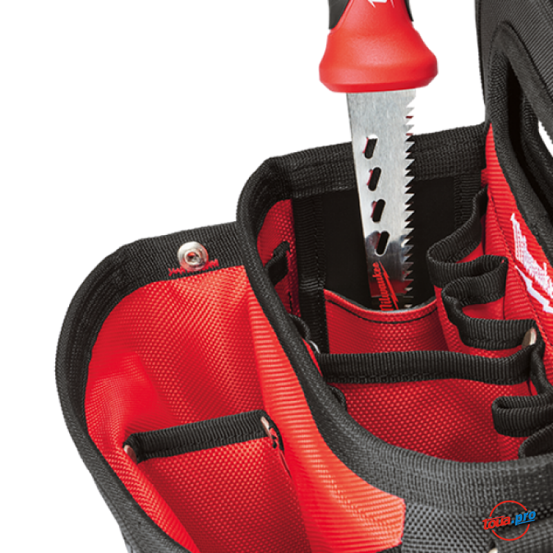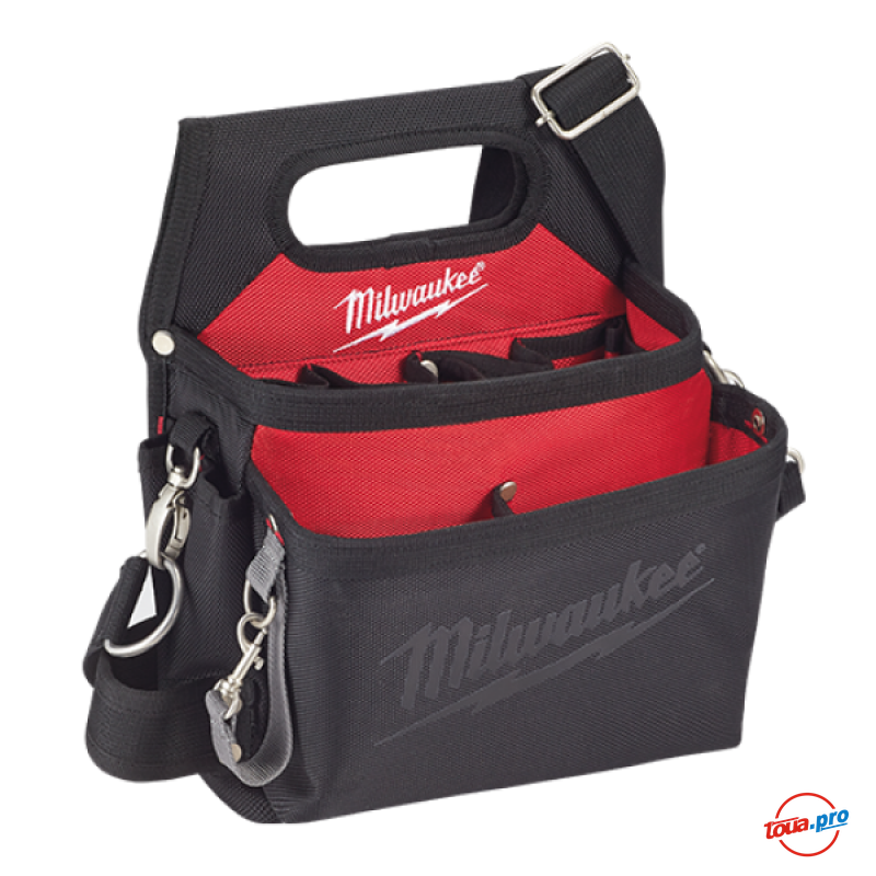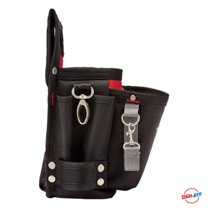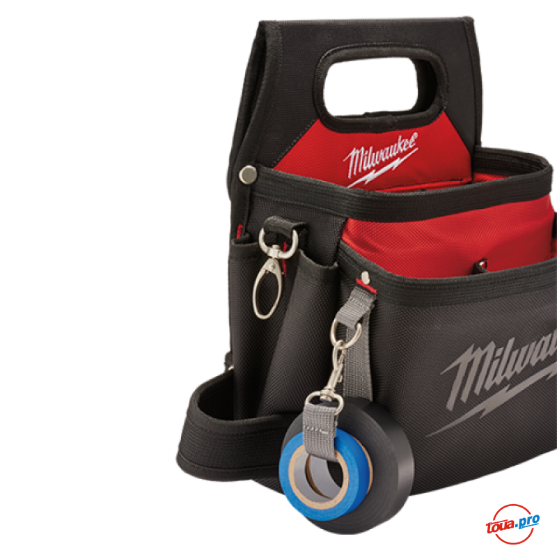 Прочная сумка электрика Milwaukee 48228112 изготовлена из баллистического нейлона, двойные швы усиленные заклепками, прочнее в 4 раза. Сумка имеет удобную ручку, большое количество карманов, поясное крепление, металлические D - образные кольца для соединения с наплечным ремнем, металлическую клипсу для крепления рулетки.